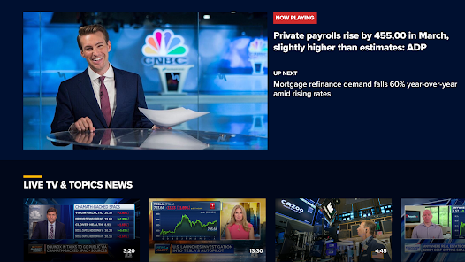 世界的なニュースが報じられると、世界中の市場に波紋が広がります。CNBCモバイルアプリでリアルタイムの報道を入手し、市場に影響を与える最新の出来事を常に把握しましょう。24時間体制の市場報道により、ニュースがいつどこで報道されても、常に最新情報を入手できます。CNBCモバイルアプリでは、正確で実用的なビジネスニュース、金融情報、市場データ、プライムタイム番組に、かつてないほど迅速にアクセスできます。速報ニュースアラートはスマートフォンに瞬時に配信されるため、市場の動向を常に把握できます。ライブストリーム、ビデオクリップ、エピソードをスマートフォンやAndroid TVデバイスで直接視聴できるので、いつでもどこでもお気に入りのCNBCプライムタイム番組を視聴できます。